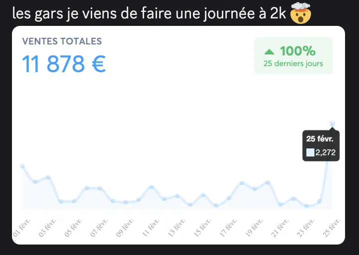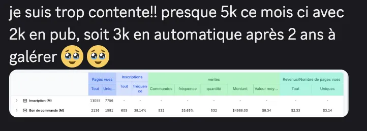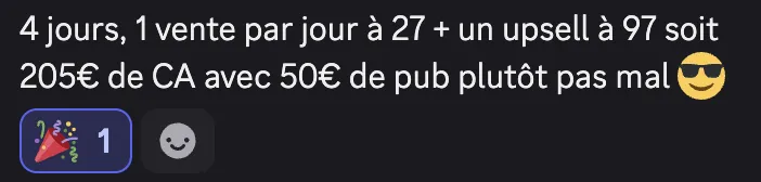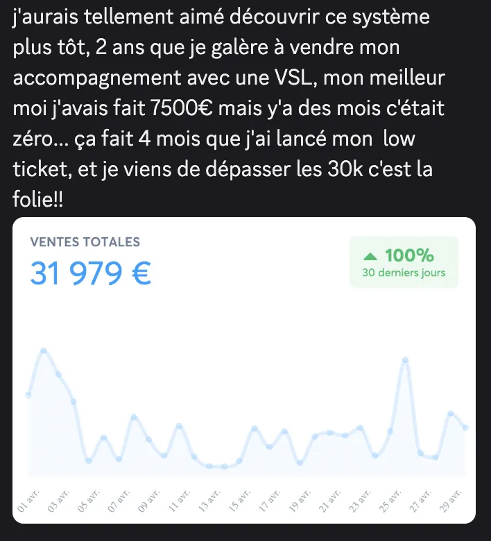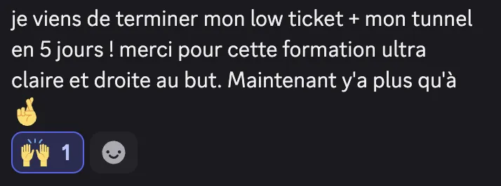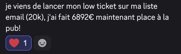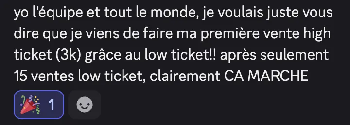 Tu nous envoies un email et nous irons personnellement acheter ton offre. Ta première vente low ticket est donc garantie d'ici 30 jours :-)